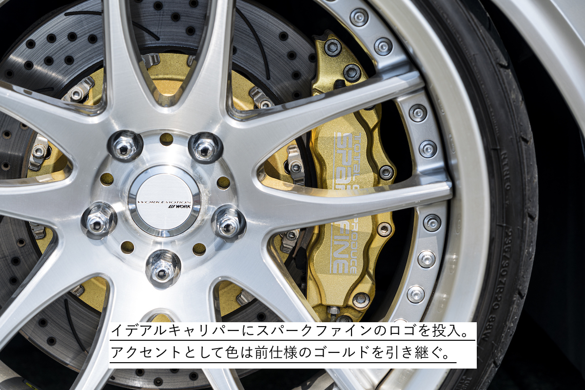 ●エアロ:(F)Kブレイク ハイパーゼロカスタム+ハイパーゼロカスタムGT ニコイチ(S)Kブレイク ハイパーゼロカスタム短縮加工(R)Kブレイク ハイパーゼロカスタム+ハイパーゼロカスタムGT用ディフューザー(W)スパークファイン オリジナル ●フェンダー:アーチ上げ、ワイド加工(F)3㎝(R)5㎝ ●ヘッドライト:LED加工、インナーブラック塗装、4連プロジェクター ●フォグランプ:Kブレイク 2連フォグ ●テールランプ:アベスト加工、レンズ塗装 ●ボディカラー:レクサス純正 銀影ラスター ●ホイール:ワークエモーション3P(フルブラッシュド、銀影ラスターペイント)20inch(F)9.5Jプラス9(R)10.5Jマイナス35 ●タイヤ:ニットー NEOテクGEN(F)235/30-20(R)245/30-20 ●足まわり:イデアル スーパーマキシマム4独エアサス ●ブレーキ:イデアル(F)8pot 380φ(R)6pot 380φ ●マフラー:スパークファイン オリジナル フルストレート、Kブレイク トレゾアダブル ●外装その他:フェンダーダクト加工、プレスライン加工(ボンネット・フェンダー・ドア・トランク) ●室内:フル張り替え(シルバー3色)、パネル類・ピラー・ステアリング シルバーラメ塗装、ドア・リアトレイ成型 ●室内オーディオ:フルロックフォード、(F)3ウェイスピーカー(R)リアシート ウーハー埋め込み、外向きスピーカー、アンプ T-1000、T-600(4枚)、サイバーナビ