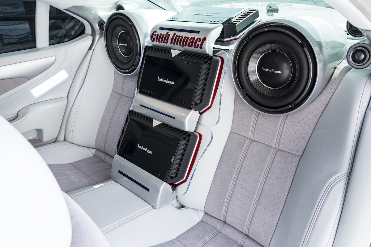 必見のインテリア。濃度の異なる3タイプのシルバーでフル張り替え。ピラーやステアリングなど一部はシルバーラメ塗装も組み合わせた。赤の差し色もポイント。後席中央にはアンプ設置+ヘッドレスト部分にウーハー埋め込み。