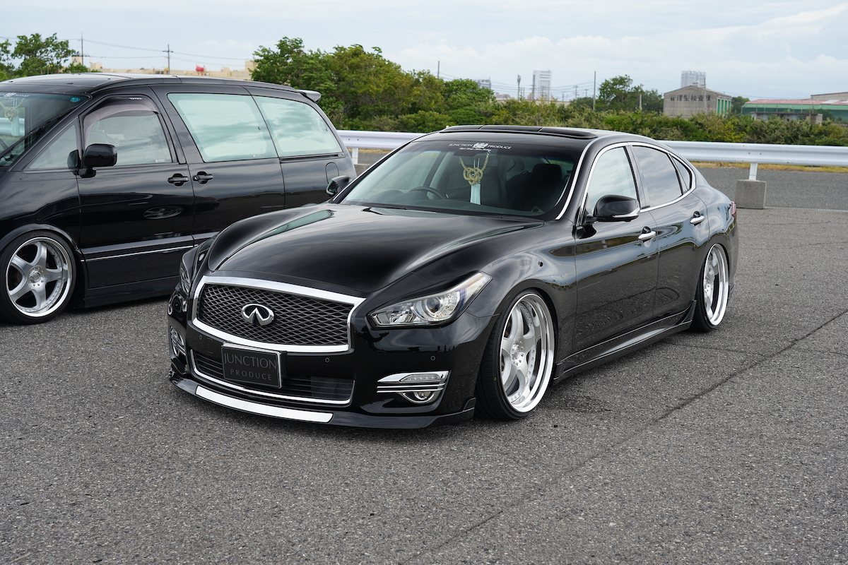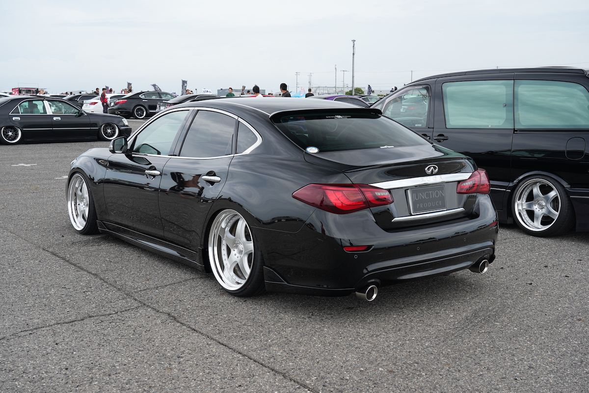 ジャンクションプロデュースが会場に持ち込んだデモカーは51フーガ。最新作のタイトリップスポイラーVSを装着。世界最小サイズが特徴のエアロパーツで、ベタベタの車高短に持って来い。もちろん、シンプルで高級感あるデザインゆえに、程良い車高で街乗りしたいオーナーたちにもオススメ。