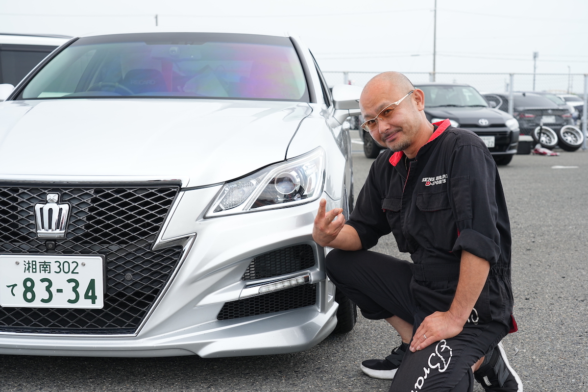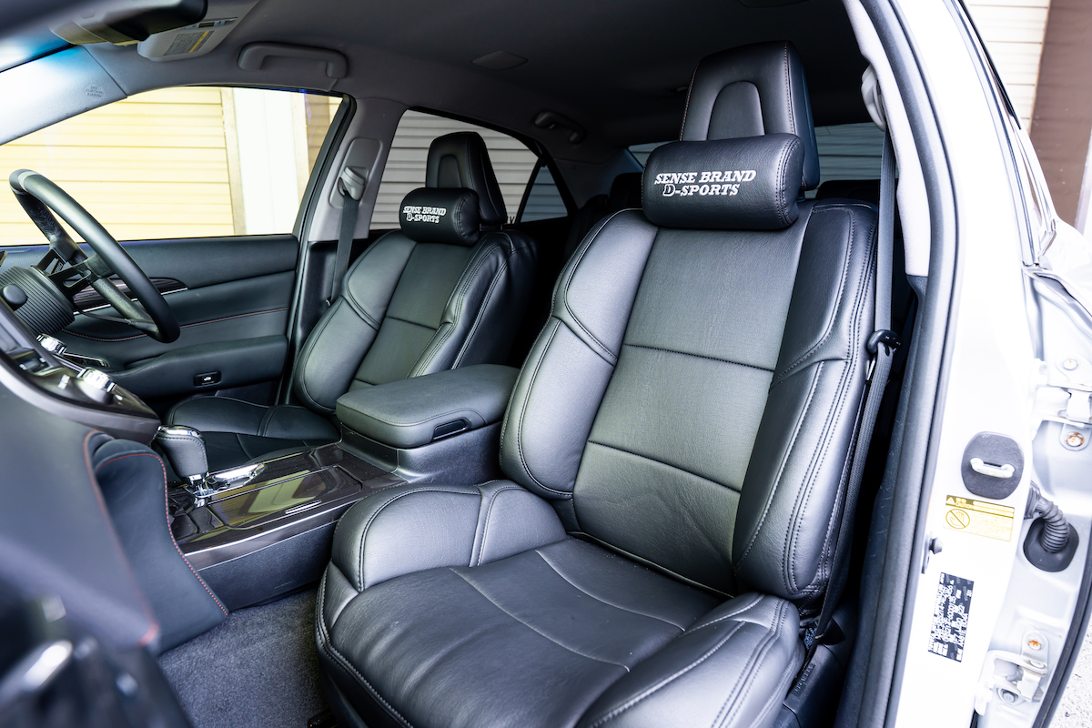 「最新作は汎用のバケットシートカバー。ドリフトをする際、シートは本当に重要なんです。ですが、本物のバケットシートにしてしまうと、室内の高級感が損なわれてしまう。また、スイッチ一つで動かせるパワーシートなど、高級セダンならではの装備も使えない。これは、それを両立できる汎用バケットシートカバー。フォールド性が高く、シートカバーなので純正機能も生かすことができるんです」とセンスブランドの結城サン。