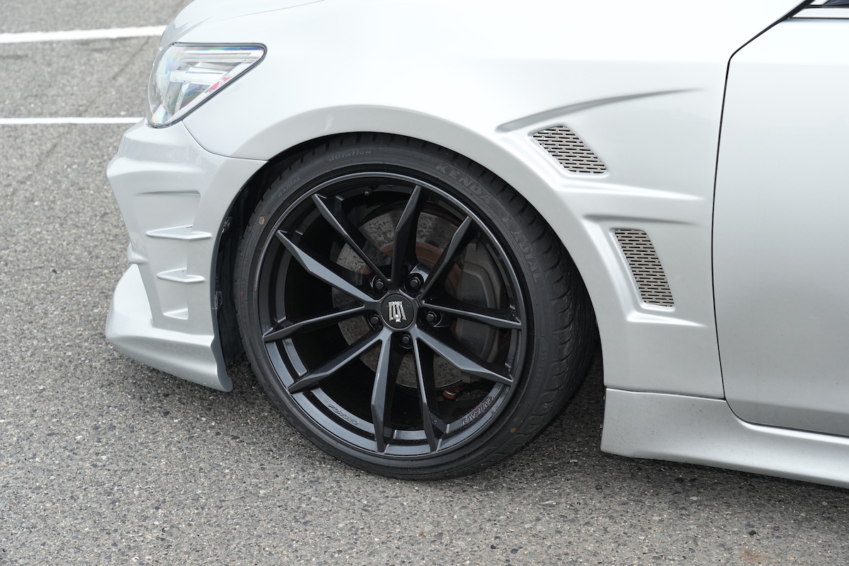 そして、センスブランドが持ち込んだデモカーも210クラウンで、フルバンパータイプの「センセーションα」を装備。存在感のあるメッキLEDデイライトを投入したスポーティな開口部。バンパーサイドやフロントフェンダーなど、随所にダクトを設けてレーシーな雰囲気に仕上げている。