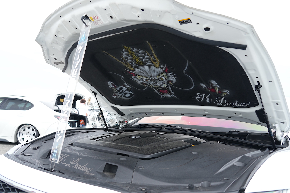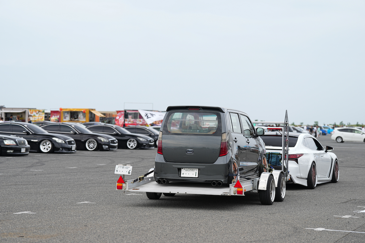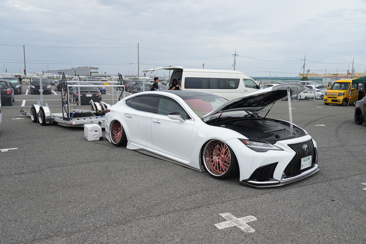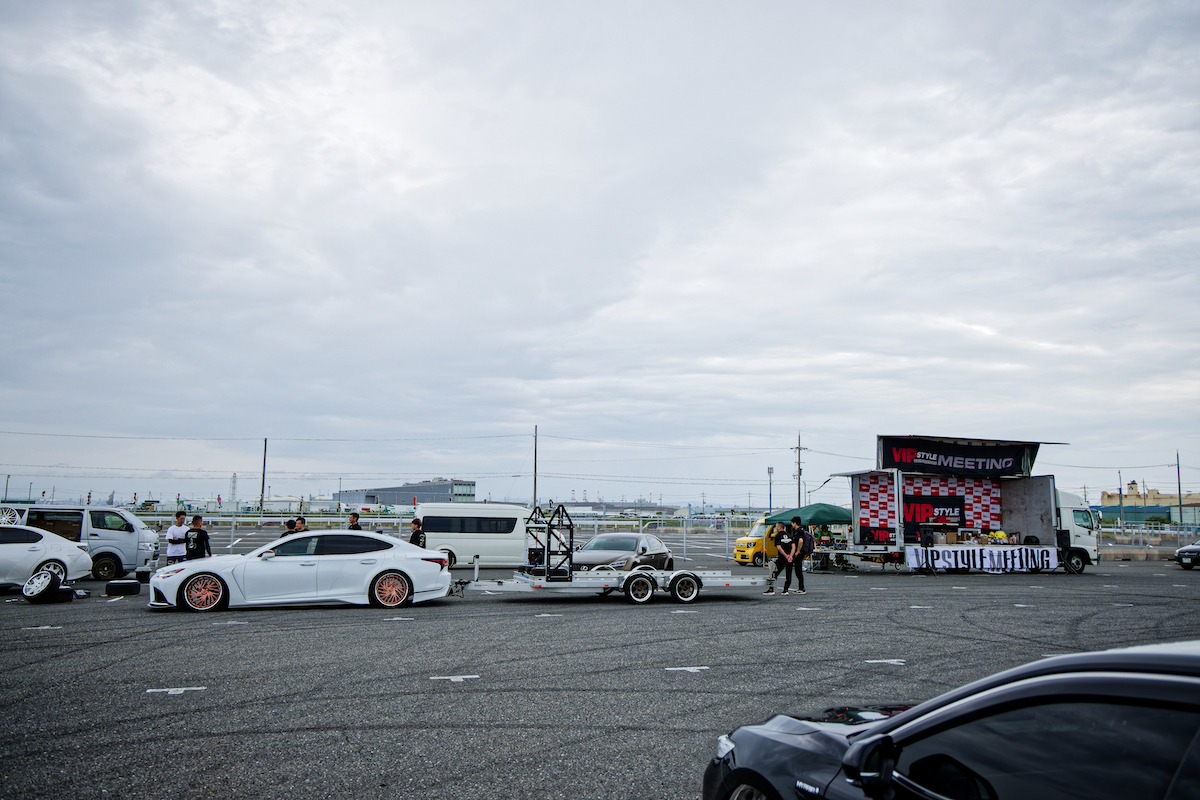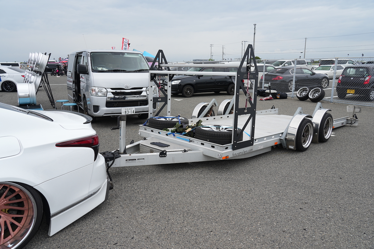 驚きなのはトレーラーを引っ張ってきたこと。「今日はVIPスタイルミーティングと共同開催のキング・オブ・Kカーにエントリーしているスティングレーを載せてきました。いつもはドリフト車輌を積んでサーキットに行ったりもしているんですよ」。