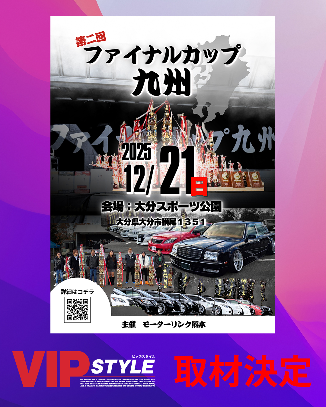 そして、今回もVIPスタイルの取材が決定。会場で輝いていたセダンを撮影し、その模様をWEBマガジンにて掲載します。2025年12月21日は「ファイナルカップ九州」で決まりだ!