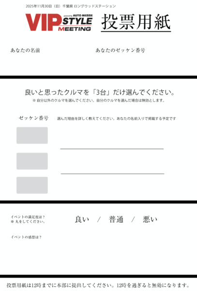 投票用紙に自分がカッコイイと思ったクルマのゼッケン番号を記入し、さらに自分の名前と投票した理由も記載して、お昼の12時までに本部に提出してください。「友達だからーー」とかじゃなくて、ガチで選んで貰えると嬉しいです!