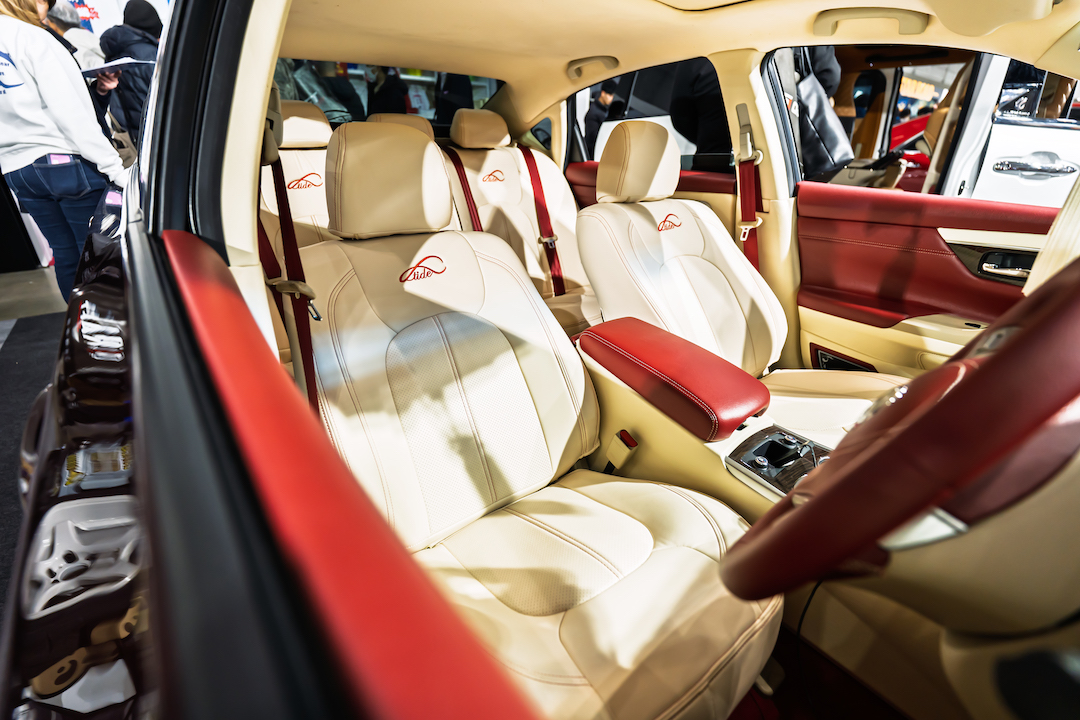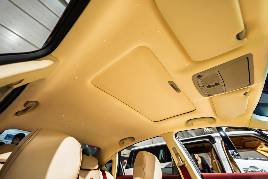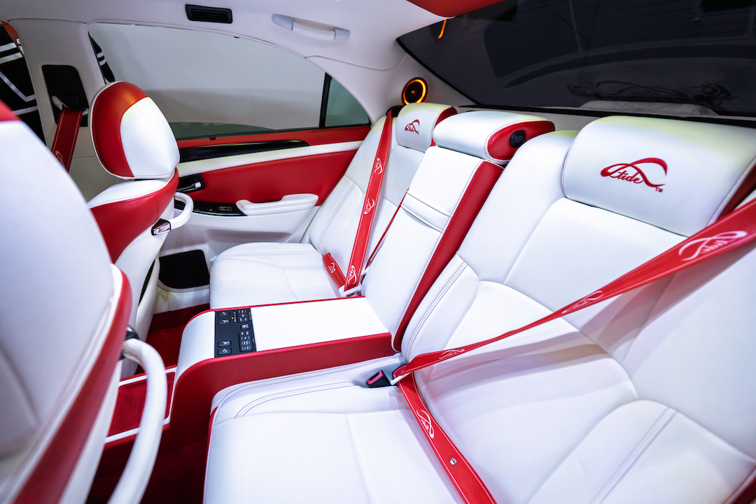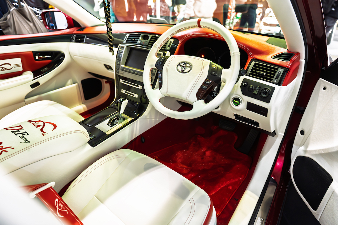 生地は高級PVCレザーを採用。天井にはスポットライト入り。パネル類は黒に変更してシックに。ちなみにカーペットも張り替え、さらにフロアマットは金色の糸が縫い込まれたラメ仕様。細部までこだわりが満載。
