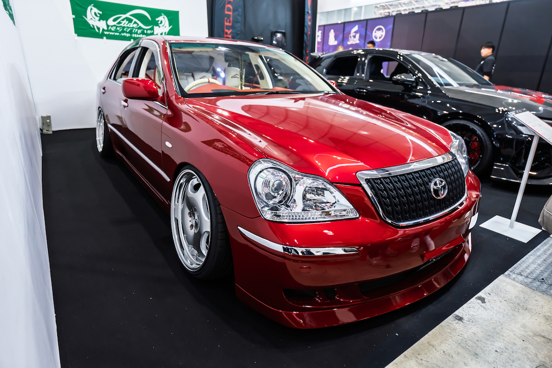 東京オートサロンにハイレベルな2台のセダンを持ち込んだエルティード。まずはオリジナルキャンディレッドの18マジェスタから見ていく。
