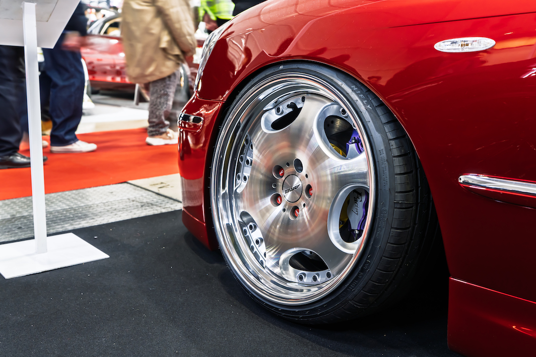 ホイールもBBS LMからAME シャレンLXに履き替え。イデアルの足まわりでガッツリとローダウンし、19インチのシャレンLXで実現したツライチも絶対必見だ。