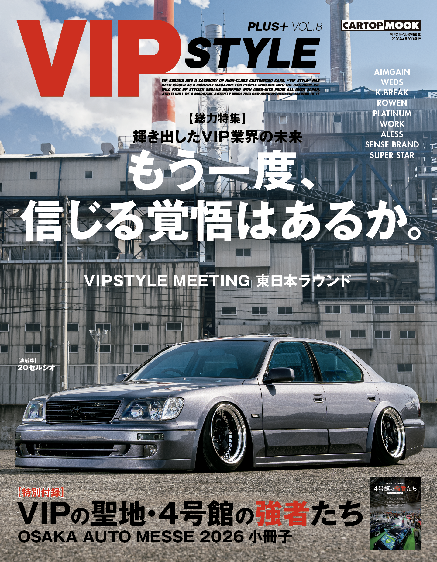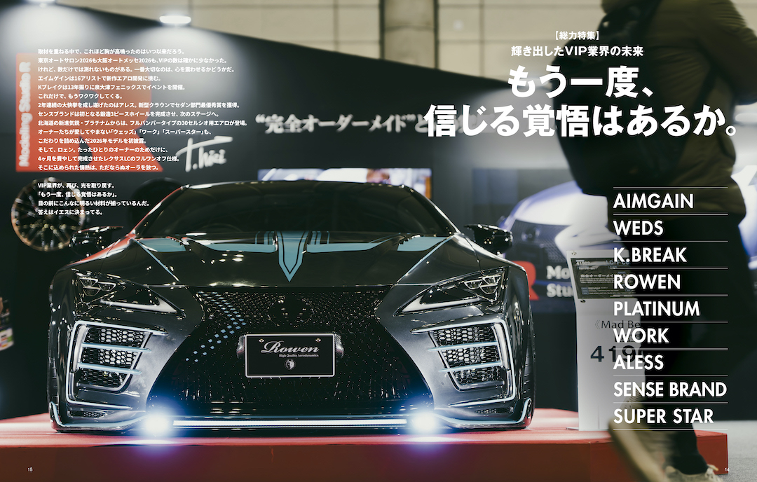 エイムゲインは16アリストで新作エアロ開発に挑む。Kブレイクは13年振りに泉大津フェニックスでイベントを開催。これだけで、もうワクワクしてくる。2年連続の大快挙を成し遂げたのはアレス。新型クラウンでセダン部門最優秀賞を獲得。センスブランドは初となる鍛造3ピースホイールを完成させ、次のステージへ。北海道の新進気鋭・プラチナムからは、フルバンパータイプの30セルシオ用エアロが登場。オーナーたちが愛してやまない「ウェッズ」「ワーク」「スーパースター」も、こだわりを詰め込んだ2026年モデルを初披露。